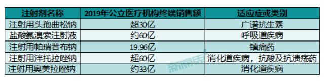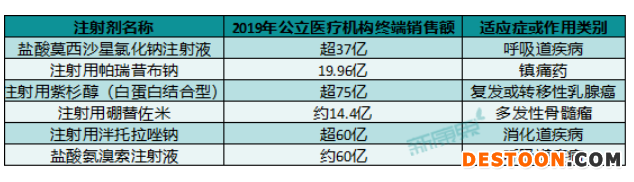 其中,碘克沙醇注射液、多西他賽注射液、鹽酸右美托咪定注射液等品類在醫(yī)院端銷售額較高,2019年樣本醫(yī)院銷售額約11億~17億元,市場潛力大,從類型上來看多為造影劑、止痛劑、腫瘤用藥等。