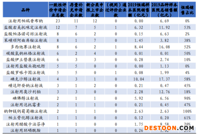 下面就以恒瑞為例,對大型藥企的注射劑申報情況作簡單分析。根據(jù)信達(dá)證券的研報顯示,截至2020年5月的統(tǒng)計,恒瑞醫(yī)藥共有約20個存量注射劑品種申報一致性評價,大部分樣本醫(yī)院銷售規(guī)模>1億元的注射劑品種,均已申報;還有部分按新分類申報上市的注射劑品種,大多目前已上市企業(yè)數(shù)較少,競爭格局良好;另有3個品種已按新分類獲批上市(視同)通過一致性評價。