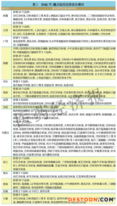 2019年國家版重點監(jiān)控品種目錄公布后,各省(市)的第一批重點監(jiān)控品種目錄紛紛公布。北京、吉林、福建、廣東、云南、天津、黑龍江、上海、山東、陜西、江蘇、重慶、甘肅、四川、遼寧、湖南、貴州沒有增補(bǔ)重點監(jiān)控品種,沿用了國家重點監(jiān)控品種目錄。其余省份各有刪減,其中中藥注射劑和營養(yǎng)類注射劑是各省增補(bǔ)的主要類別。