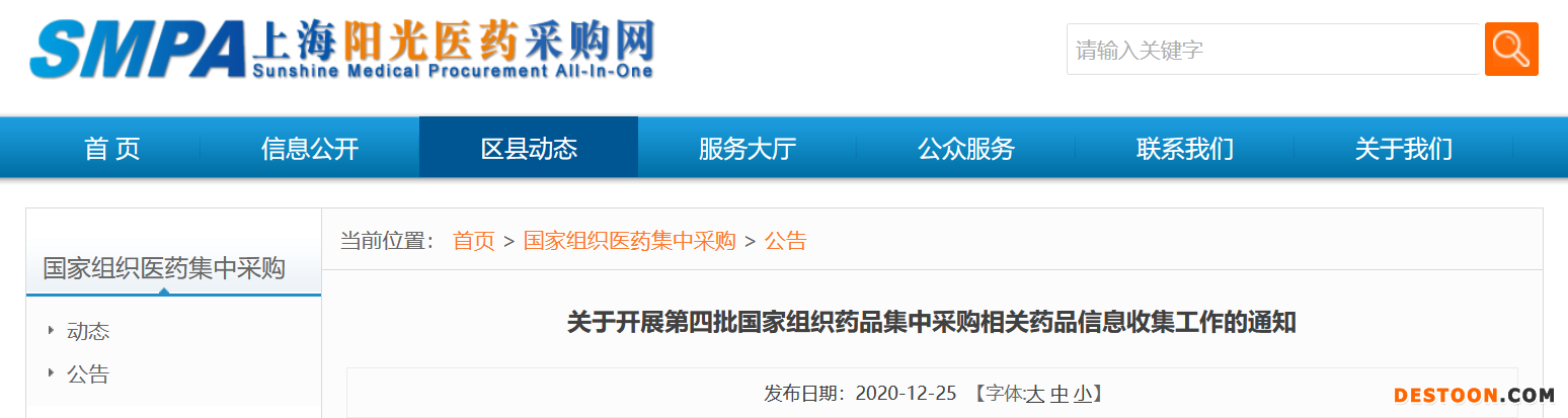 12月28日訊 12月25日,上海陽光醫(yī)藥采購網發(fā)布《關于開展第四批國家組織藥品集中采購相關藥品信息收集工作的通知》,第四批國家集采信息申報工作正式開啟。