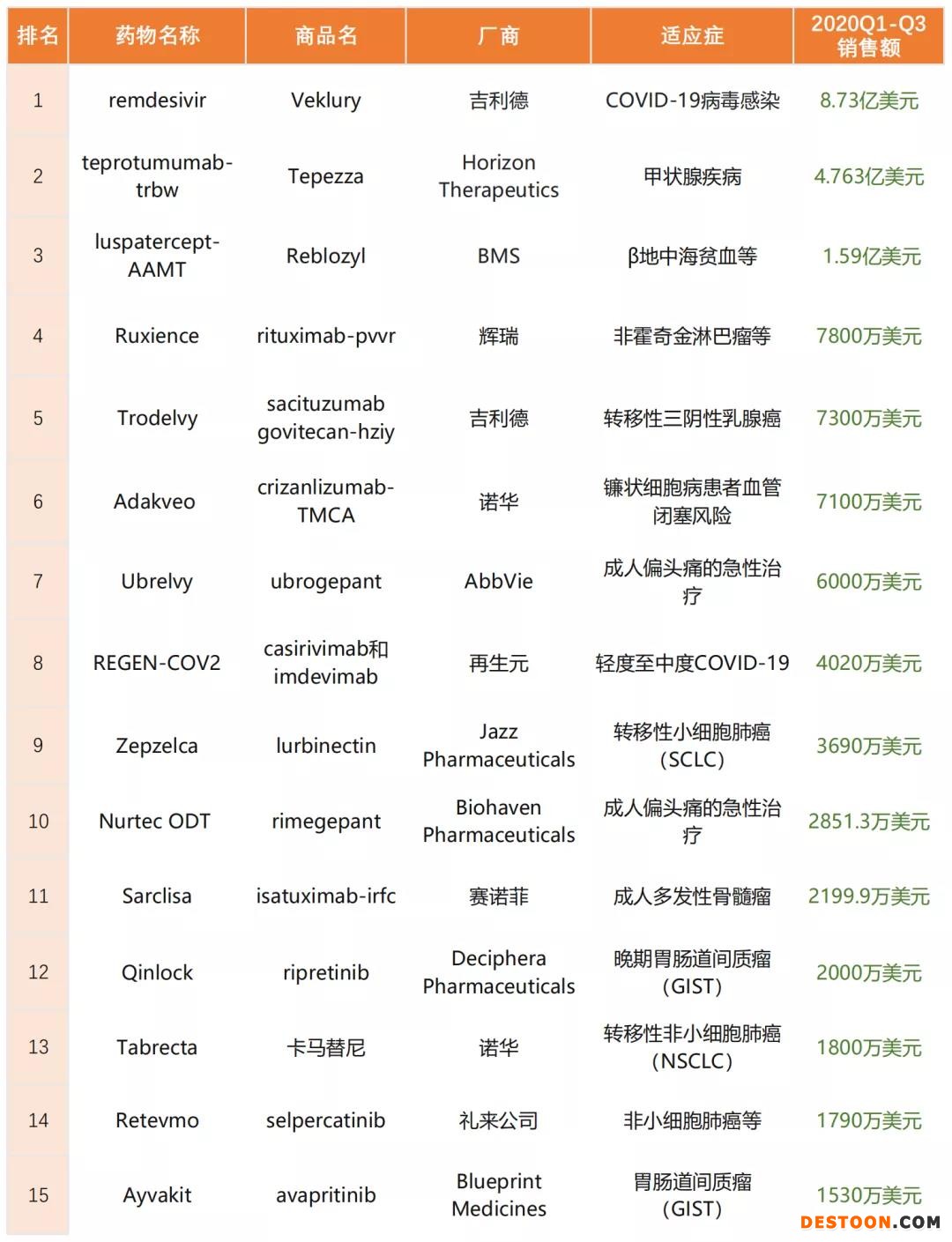 如果說(shuō)上述藥品因?yàn)?020年獲批的新藥而導(dǎo)致銷售體量不大,那么2020年最暢銷的Top10,可以從全球跨國(guó)藥企Q3季度報(bào)中看出。