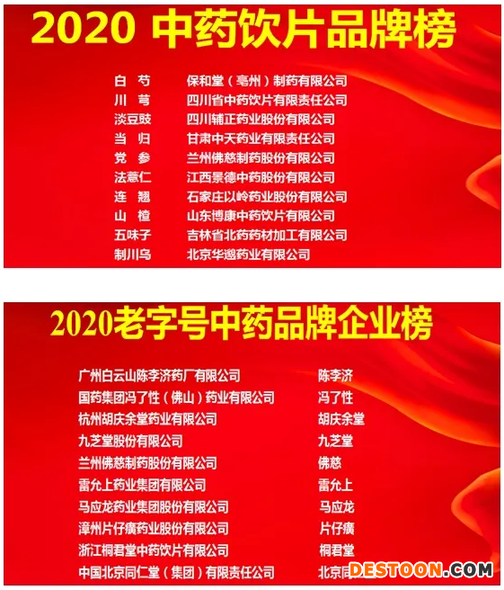 在第二屆中國(guó)中藥品牌建設(shè)大會(huì)上,中國(guó)中國(guó)協(xié)會(huì)公布了2020臨床價(jià)值中成藥品牌榜、中藥飲片品牌榜、中藥飲片品牌企業(yè)榜、老字號(hào)中藥品牌企業(yè)、中藥上市公司20強(qiáng)、中成藥企業(yè)100強(qiáng)六個(gè)榜單。