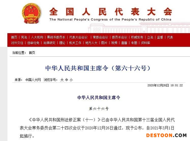 12月31日訊 據(jù)全國人大官網(wǎng)消息,《中華人民共和國刑法修正案(十一)》已由中華人民共和國第十三屆全國人民代表大會(huì)常務(wù)委員會(huì)第二十四次會(huì)議于2020年12月26日通過,自2021年3月1日起施行。