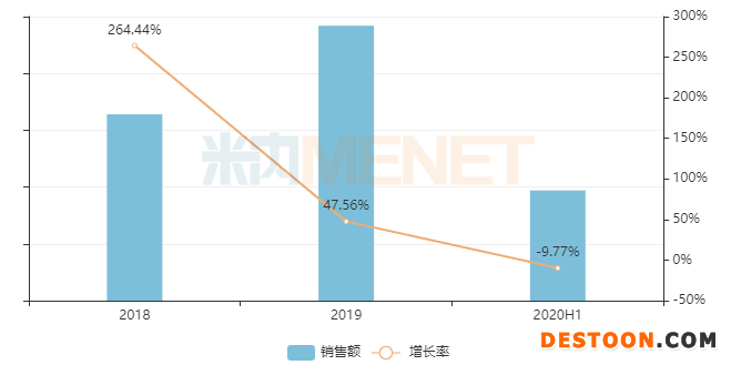 上海仁會生物制藥的1類新藥貝那魯肽注射液于2016年底獲批上市,是全球首個氨基酸序列與人源完全一致的GLP-1類藥物,主要用于2型糖尿病的治療。米內(nèi)網(wǎng)數(shù)據(jù)顯示,在中國公立醫(yī)療機構(gòu)終端,貝那魯肽注射液進入市場后在2018年迎來一波猛漲,2019年銷售額達484萬元,2020上半年受疫情影響,增速下滑。