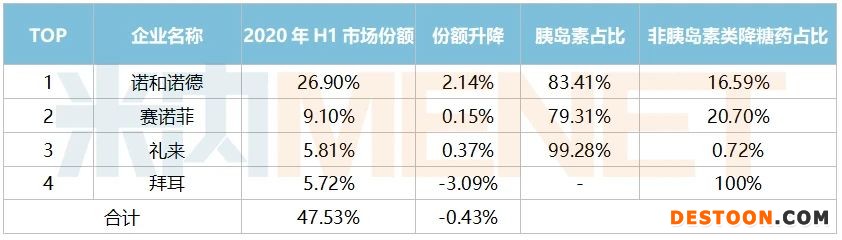 米內(nèi)網(wǎng)數(shù)據(jù)顯示,2019年中國公立醫(yī)療機構(gòu)終端糖尿病用藥市場中,胰島素及非胰島素類降糖藥合計銷售規(guī)模超過500億元。該市場TOP4企業(yè)被跨國藥企占據(jù),2020上半年合計市場份額接近五成,其中諾和諾德、賽諾菲、禮來在胰島素領(lǐng)域占據(jù)高地,拜耳則稱霸非胰島素類降糖藥領(lǐng)域。