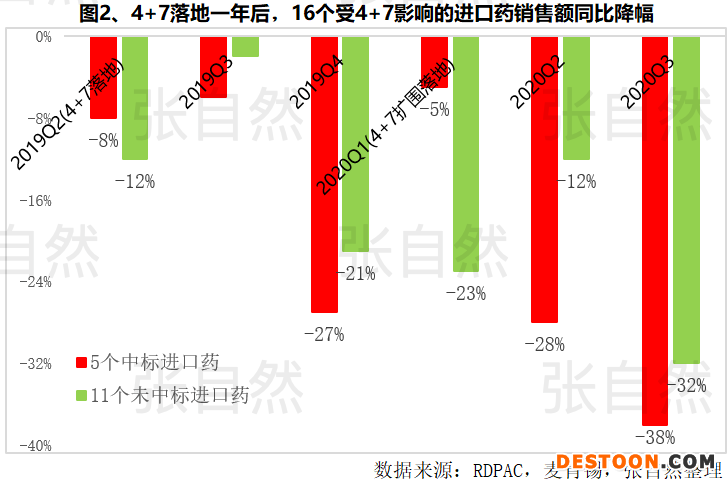 仿制藥替代原研本就是帶量采購的初衷之一,集采中選價已成為價格天花板,不管是否直接參與帶量采購,與集采同一通用名的原研藥都將受到集采影響而現(xiàn)專利懸崖,就以其中16個原研藥為例,有5個參加了4+7、11個沒有參加4+7,但在4+7執(zhí)行一年之后的銷售較之前一年的同比都出現(xiàn)了大幅下降,銷售額共下降了15億美元之巨。(圖2)