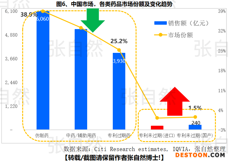 2018年,仿制藥、中藥/輔助用藥和原研藥占據(jù)全國97%的市場,而專利保護期內的新藥只占不到3%。其中仿制藥6060億元,占全國的近四成(38.9%)、專利過期原研藥3930億元,占全國的1/4(25.2%),隨著帶量采購覆蓋范圍的不斷擴大,仿制藥大幅降價,原研藥受被替代和降價的雙重打擊,仿制藥和原研藥的市場規(guī)模都將大幅降低,而中藥盡管政策利好空前,但在臨床終端仍不受待見,而輔助用藥更是飽受醫(yī)保踢出和合理用藥考核的夾擊而繼續(xù)下降。