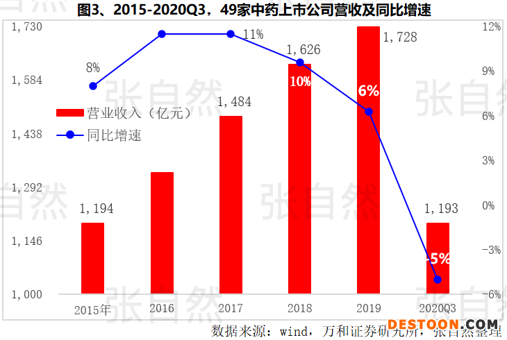49家中藥上市公司的銷售增速已由2016年的12%下降到了2019年的6%,2020年第三季度不但不增長,反而首次出現(xiàn)了下降,降幅高達5%,除受新冠疫情影響外,前面所提也是重要原因。(圖3)