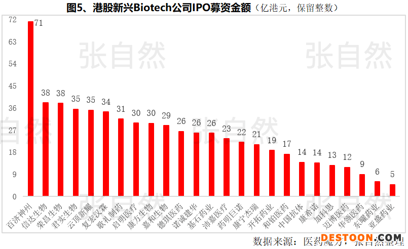 自2018年4月底,港交所修改規(guī)則,允許未通過主板財務資格測試的生物科技企業(yè)上市以來,已有25家未盈利的Biotech公司赴港上市,最高的融資高達70.9億港元(百濟神州),大幅推進了關鍵臨床項目、生產(chǎn)基地建設、研發(fā)管線補充以及商業(yè)化團隊建設等的進展(圖5)。在科創(chuàng)版IPO成功的創(chuàng)新藥企則更多。