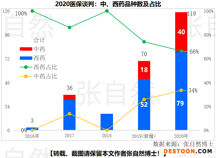 在本次談判調(diào)入的119個品種中,中、西藥分別為40個和79個,各占了34%和66%,中藥占比較以往歷次談判的都高,體現(xiàn)了國家對中醫(yī)藥產(chǎn)業(yè)的支持和鼓勵,2019年談判成功的70個新增品種中,中藥為18個,僅占26%。
