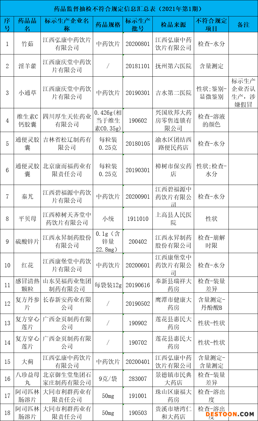 近日,江西省藥監(jiān)局發(fā)布了“2021年第1期藥品監(jiān)督抽檢信息公告”(以下簡(jiǎn)稱“公告”)。