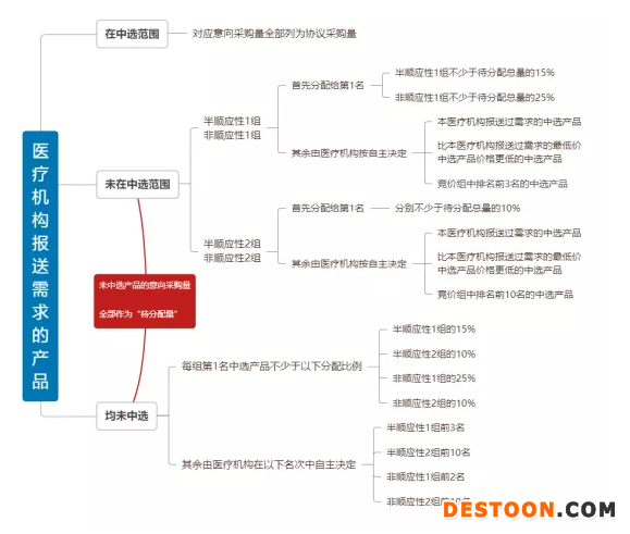 關(guān)于采購量的分配,和國家項(xiàng)目類似,同樣分為醫(yī)療機(jī)構(gòu)報(bào)送需求的產(chǎn)品“在中選范圍”、“未在中選范圍”、“均未中選“三種情況進(jìn)行討論。非中選產(chǎn)品的意向采購量將作為待分配量,依照如下順序分配:①首先分配給每組排名第一的中選產(chǎn)品,分配量不少于一定比例;②其余待分配量由醫(yī)療機(jī)構(gòu)自主決定,可分配給本醫(yī)療機(jī)構(gòu)報(bào)送過需求的中選產(chǎn)品,或比本醫(yī)療機(jī)構(gòu)報(bào)送過需求的最低價(jià)中選產(chǎn)品價(jià)格更低的中選產(chǎn)品,或排名靠前的中選產(chǎn)品。照此規(guī)則,每組報(bào)價(jià)較低的前幾名企業(yè)可以搶占剩余份額,剩余企業(yè)只能維持份額。具體分配規(guī)則如下圖所示。