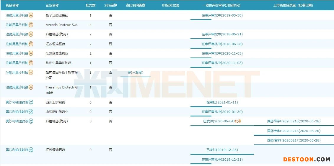 2020年6月,齊魯?shù)膴W沙利鉑注射液3類仿制上市申請獲批并視同過評,成為了該品種首家過評企業(yè)。目前除了四川匯宇制藥的3類仿制上市申請在審批外,還有山東新時代藥業(yè)、江蘇恒瑞醫(yī)藥的受理號在審評審批中。此外,注射用奧沙利鉑目前已有揚子江、奧賽康、中美華東等5家藥企申報一致性評價,相關受理號正在審評審批中。