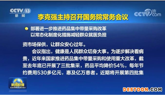 1月18日訊 1月15日,央視新聞聯(lián)播播發(fā)國(guó)務(wù)院常務(wù)會(huì)議重點(diǎn)內(nèi)容,會(huì)議指出,部署進(jìn)一步推進(jìn)藥品集中帶量采購(gòu)改革,以常態(tài)化制度化措施減輕群眾就醫(yī)負(fù)擔(dān),即將開(kāi)展的第四批集采,重點(diǎn)聚焦基本醫(yī)保藥品目錄內(nèi)用量大、采購(gòu)金額高的藥品納入采購(gòu)范圍。