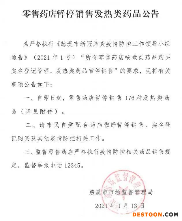 1月14日,余姚市市場監(jiān)督管理局發(fā)布《關(guān)于零售藥店暫停銷售發(fā)熱類藥品的公告》。