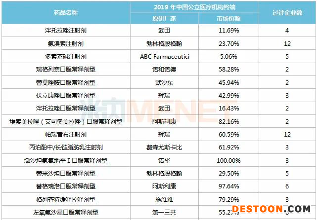 此外這21個藥品中有11個藥品的原研廠家在2019年中國公立醫(yī)療機構(gòu)終端競爭格局中的市場份額超過50%,其中纈沙坦氨氯地平Ⅰ口服常釋劑型、索拉非尼口服常釋劑型基本由原研廠家獨占。