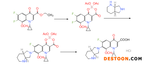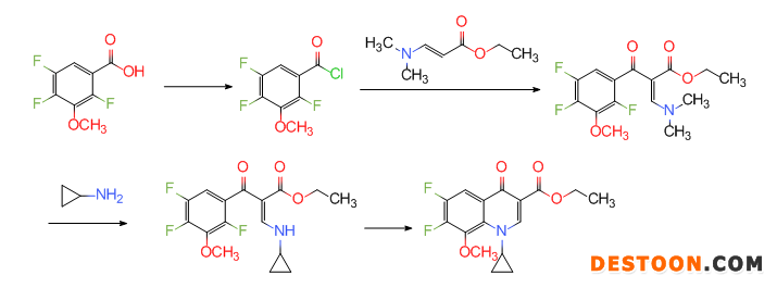 片段二為8-甲氧基氟喹諾酮類結(jié)構(gòu),以1-環(huán)丙基-6,7-二氟-1,4-二氫-8甲氧基-4-氧代-3-喹啉羧酸乙酯(CAS:112811-71-9)起始原料反應(yīng)制得,其合成路線如下:
