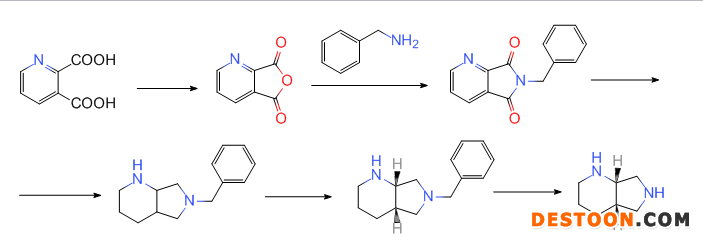 從結(jié)構(gòu)來看主要由兩個(gè)片段組成,片段一為(S,S)-2,8-二氮雜二環(huán)[4,3,0]壬烷(CAS:151213-40-0),作為本品合成的起始原料之一;合成路線如下: