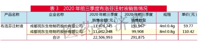 2020年前三季度,非甾體抗炎藥布洛芬各種劑型在樣本醫(yī)院的銷售額為7641萬元(骨骼與肌肉用藥的放大倍數(shù)為2.65,則放大至全國公立醫(yī)院購藥金額為7641萬元×2.65約為2.025億元,下同),布洛芬注射液2個規(guī)格的銷售額為2251萬元,約占29.46%,不到三分之一。