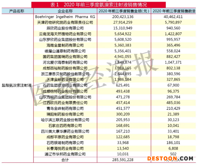 數(shù)據(jù)顯示,2020年前三季度祛痰藥氨溴索各種劑型在樣本醫(yī)院的銷售額為4.238億元(呼吸系統(tǒng)用藥的放大倍數(shù)為3.12,則放大至全國公立醫(yī)院購藥金額為4.238×3.12約為13.22億元,下同),氨溴索注射液3個規(guī)格的銷售額為2.856億元,約占67.39%,超過三分之二。