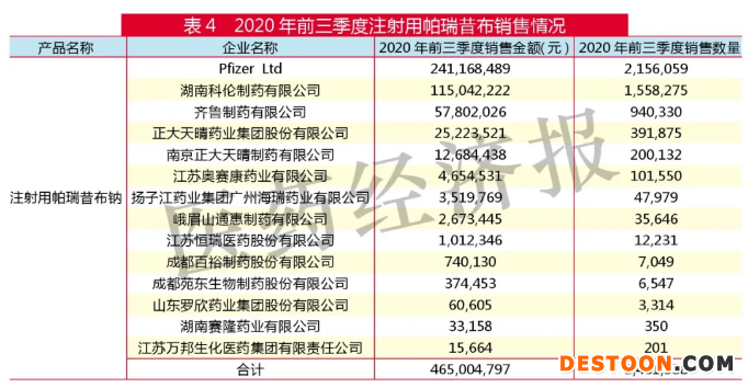 從表4可以看出,輝瑞的銷售處于領(lǐng)先地位,湖南科倫和齊魯制藥次之,共有14家廠家顯示銷售。從2016-2020年的樣本醫(yī)院銷售數(shù)據(jù)來看,注射用帕瑞昔布銷售額呈現(xiàn)上升趨勢,從2016年的2.780億元上升到2019年的5.909億元,2020年前三季度銷售額為4.650億元,預(yù)計2020年全年銷售將突破6億元。