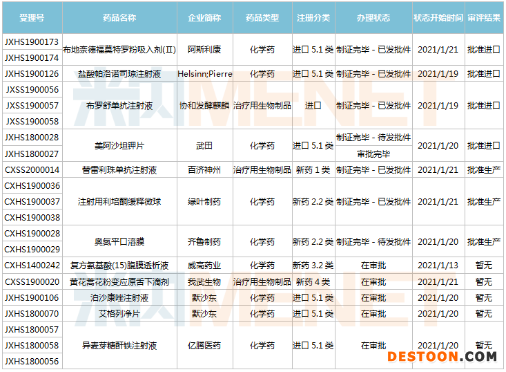1月9日-1月22日期間,12個新藥(21個受理號)的上市申請有審評審批狀態(tài)更新。其中,齊魯制藥的奧氮平口溶膜、百濟神州的替雷利珠單抗注射液、綠葉制藥的注射用利培酮緩釋微球獲批生產(chǎn);武田的美阿沙坦鉀片、阿斯利康的布地奈德福莫特羅粉吸入劑(Ⅱ)、Helsinn的鹽酸帕洛諾司瓊注射液、協(xié)和發(fā)酵麒麟的布羅舒單抗注射液獲批進口;默沙東的泊沙康唑注射液及艾格列凈片、我武生物的黃花蒿花粉變應(yīng)原舌下滴劑……5個藥品的上市申請注冊辦理狀態(tài)變更為“在審批”。