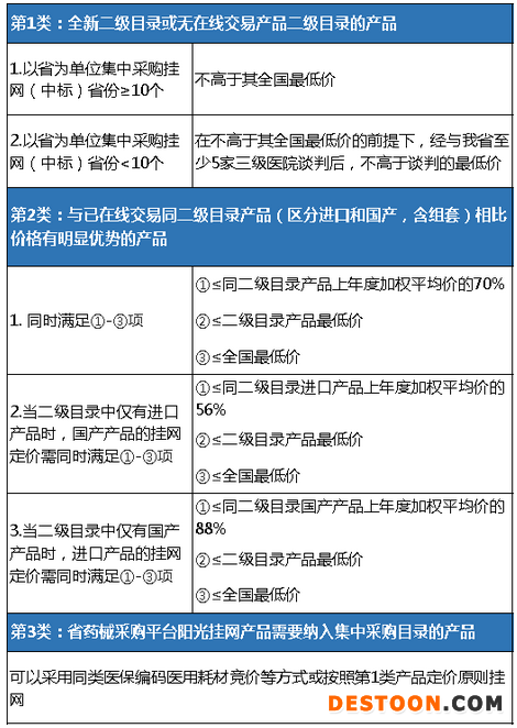 《方案》明確對于“全新二級目錄或無在線交易產(chǎn)品二級目錄的產(chǎn)品”,在以省為單位集中采購掛網(wǎng)(中標)省份達10個及以上的,不高于其全國最低價;不足10個的,在不高于其全國最低價的前提下,經(jīng)與我省至少5家三級醫(yī)院談判后,不高于談判的最低價。全新二級目錄須在功能、適用范圍、結(jié)構(gòu)性能組成等方面與現(xiàn)有二級目錄有較大區(qū)別,并經(jīng)專家論證后確定。