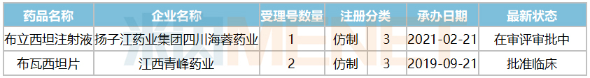 優(yōu)時(shí)比的布立西坦片進(jìn)口5.1臨床申請(qǐng)已獲批,國(guó)內(nèi)藥企中江西青峰藥業(yè)申報(bào)了布瓦西坦片3類仿制上市申請(qǐng)已獲批臨床,而注射劑目前僅有揚(yáng)子江申報(bào)3類仿制上市并在審評(píng)審批中。