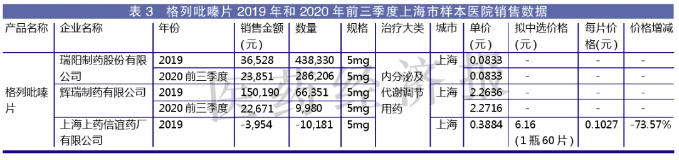 2020年前三季度,格列吡嗪在全國樣本醫(yī)院的銷售額為3790萬元。在上海市樣本醫(yī)院,2019和2020年有銷售數(shù)據(jù)的是輝瑞和北京紅林制藥兩家的5mg格列吡嗪控釋片以及輝瑞和瑞陽制藥兩家的5mg格列吡嗪片劑。格列吡嗪控釋片和片劑2019年在上海市樣本醫(yī)院的銷售額分別為321.9萬元和18.3萬元。