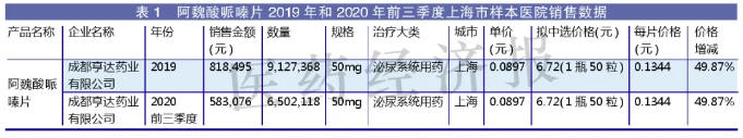 2020年前三季度,阿魏酸哌嗪在全國樣本醫(yī)院的銷售額為1814萬元。在上海市樣本醫(yī)院,2019和2020年有銷售數(shù)據(jù)的只有成都亨達(dá)藥業(yè)有限公司的50mg阿魏酸哌嗪片劑,2019年在上海市樣本醫(yī)院的銷售額是81.85萬元,市場量很小。