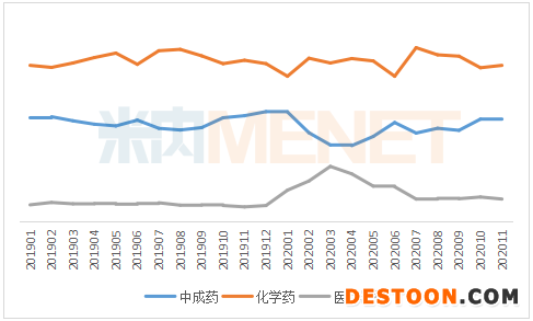 圖3:2019年1月-2020年11月樣本城市零售藥店化學(xué)藥全身用抗感染藥物份額走勢