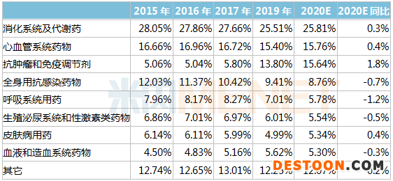 剛性需求的消化系統(tǒng)及代謝藥、心血管系統(tǒng)藥物的市場地位仍保持不變,長期占據(jù)化學(xué)藥的第一和第二位。前三大品類的市場份額均在15%以上,同比2019年均有上升,呈現(xiàn)強(qiáng)者恒強(qiáng)的局面。