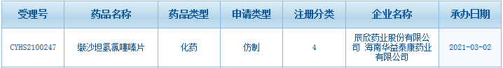 3月3日訊 3月2日,CDE官網(wǎng)顯示,辰欣藥業(yè)|海南華益泰康藥業(yè)的纈沙坦氫氯噻嗪片以仿制4類(lèi)提交上市申請(qǐng)獲受理。米內(nèi)網(wǎng)數(shù)據(jù)顯示,2019年在中國(guó)公立醫(yī)療機(jī)構(gòu)終端和中國(guó)城市實(shí)體藥店終端纈沙坦氫氯噻嗪片劑合計(jì)銷(xiāo)售額超過(guò)10億元。