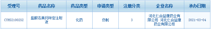 3月8日訊 3月4日,CDE官網(wǎng)顯示,河北仁合益康藥業(yè)的鹽酸右美托咪定注射液以仿制3類報產(chǎn)獲受理。今年以來,鹽酸右美托咪定注射液已有云南龍海天然植物藥業(yè)、辰欣藥業(yè)提交上市申請在審評審批中(在藥審中心)。米內(nèi)網(wǎng)數(shù)據(jù)顯示,2019年中國公立醫(yī)療機構(gòu)終端右美托咪定注射劑銷售額超過35億元。目前,鹽酸右美托咪定注射液的生產(chǎn)廠家已有揚子江藥業(yè)集團、江蘇恒瑞醫(yī)藥、湖南科倫制藥、成都倍特藥業(yè)等12家;鹽酸右美托咪定氯化鈉注射液僅有江蘇恒瑞醫(yī)藥一家。