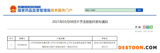3月11日訊 3月8日,國家藥品監(jiān)督管理局政務(wù)服務(wù)門戶更新《不予注冊(cè)批件發(fā)布通知》,杭州安旭生物科技股份有限公司(簡稱“安旭生物”)關(guān)鍵產(chǎn)品——人類免疫缺陷病毒抗體/丙型肝炎病毒抗體/乙型肝炎病毒表面抗原/梅毒螺旋體抗體聯(lián)合檢測試劑盒(免疫層析法),正式給予不予注冊(cè)批件。