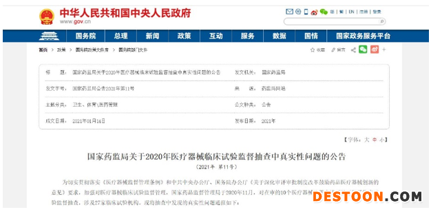 為加強(qiáng)對(duì)醫(yī)療器械臨床試驗(yàn)監(jiān)督管理,國家藥品監(jiān)督管理局于2020年11月對(duì)在審的10個(gè)醫(yī)療器械注冊(cè)申請(qǐng)項(xiàng)目開展了臨床試驗(yàn)監(jiān)督抽查,涉及27家臨床試驗(yàn)機(jī)構(gòu)。