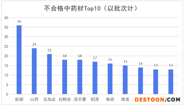 從藥品品種類型看,2020年藥品質(zhì)量不合格多以中藥材為主,前10名中中藥材8種, “前胡”以36批次占據(jù)榜首,“山藥”“五加皮”“白鮮皮”“淫羊藿”分列2至5名。