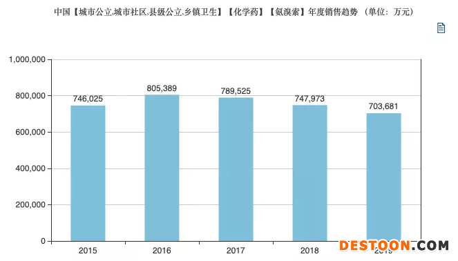 近年來(lái),氨溴索的銷售額有所下滑,不過降幅不大,相對(duì)穩(wěn)定,依舊保持在一個(gè)較高的水平。米內(nèi)網(wǎng)數(shù)據(jù)顯示,2019年中國(guó)公立醫(yī)療機(jī)構(gòu)終端氨溴索銷售額超過70億元。