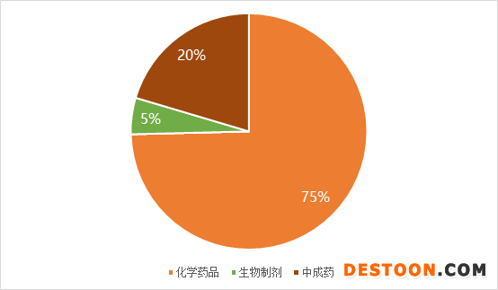 2020年上海市醫(yī)院藥品銷售市場化學(xué)藥品占比達75%,中成藥和生物制劑占比位列二、三,占比分別為20%和5%。