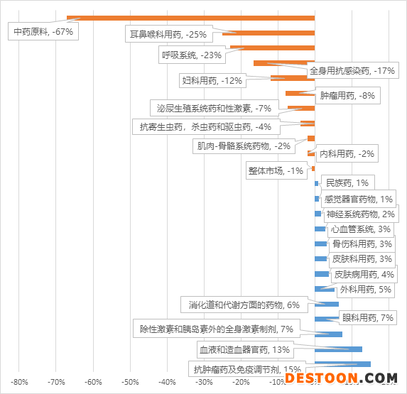 圖5 2020年上海醫(yī)院藥品市場不同治療領(lǐng)域增速表現(xiàn)