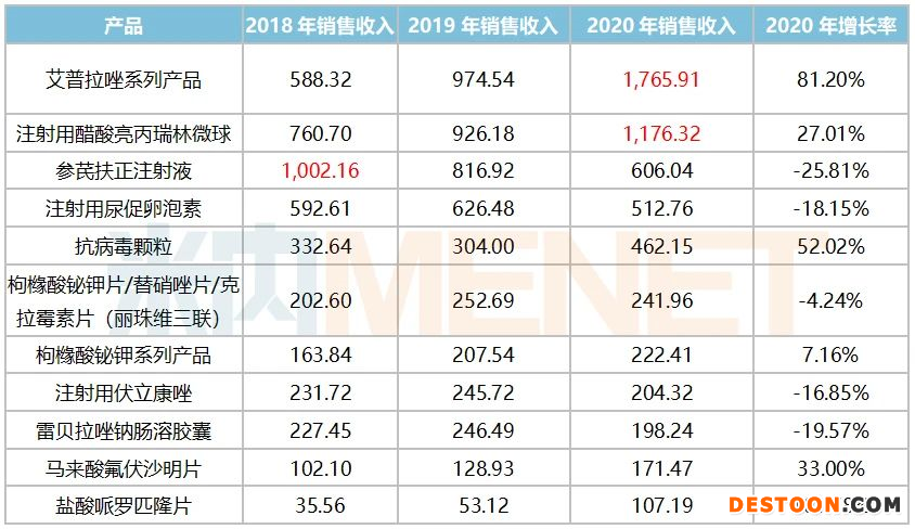 2020年公司多個制劑產(chǎn)品銷售收入呈暴漲態(tài)勢:獨家創(chuàng)新藥艾普拉唑成功進入10億大品種的隊列,銷售收入增長81.20%。其中,艾普拉唑腸溶片銷售收入為9.5億元,同比增長8.84%;注射用艾普拉唑鈉于2018年獲批上市,2019年談判成功進入全國醫(yī)保目錄,當年銷售收入即破1億元,同比增長667.09%,2020年銷售收入為8.2億元,同比增長672.61%。連續(xù)兩年的高速增長并未讓麗珠集團停下腳步,據(jù)悉,注射用艾普拉唑鈉新適應癥“預防重癥患者的應激性潰瘍出血”的臨床試驗已于2020年12月獲NMPA批準;此外,公司透露未來四年將投入2億元在“艾普拉唑系列創(chuàng)新產(chǎn)品深度開發(fā)及產(chǎn)業(yè)化升級項目”,該獨家品種有望繼續(xù)做大做強。