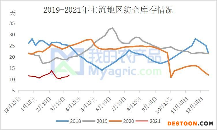 因近年市場價格波動頻繁,紡企抗風險意識越來越強,多數(shù)廠家多按單生產(chǎn),常規(guī)備貨較少,且前期貿(mào)易商囤貨意愿較強,因此當前紡企紗線成品庫存偏低。截止3月26日,全國主要地區(qū)紡企紗線庫存為11.8天,較上周增加0.7天,環(huán)比增加6.3%,較去年同期減少13天,同比減少52.4%。因部分紗廠后期訂單跟進不足,部分常規(guī)品種庫存少量增加,但整體增幅不大,紗廠庫存壓力不大。