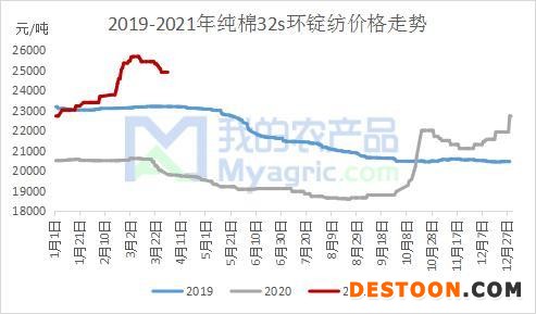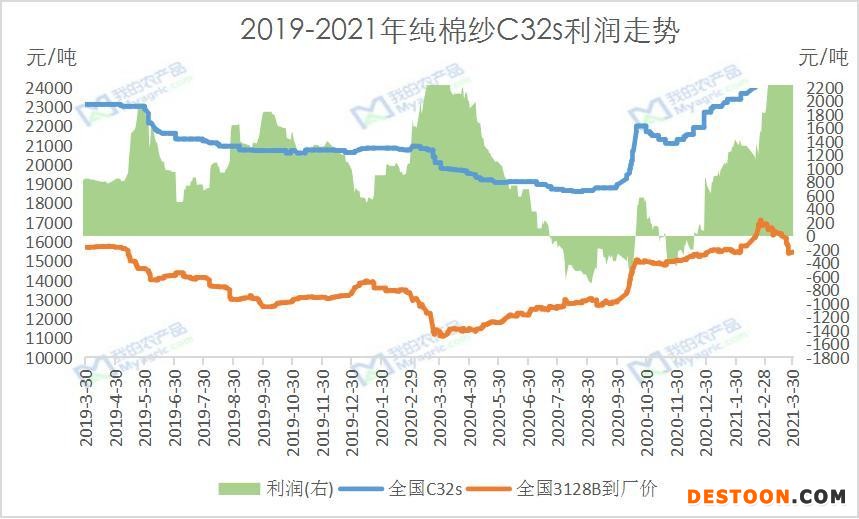 據(jù)我的農(nóng)產(chǎn)品跟蹤數(shù)據(jù),截止3月30日,全國環(huán)錠紡32s純棉紗環(huán)錠紡的紡紗利潤為2881.9元/噸,連續(xù)八個工作日維持在2500元/噸以上的水平,部分紗廠高支紗利潤達5000元/噸,多數(shù)紗企表示今年紡織市場經(jīng)歷近幾年的好行情。紡織即期利潤之所以如此可觀原因有二:一是紡企目前在紡訂單多為節(jié)后預售訂單,且當時紗價處于較高位置;二是紡企原料庫存充裕,多在1.5個月以上,部分紗企在4到5個月,且多為逢低采購,原料成本相對較低。