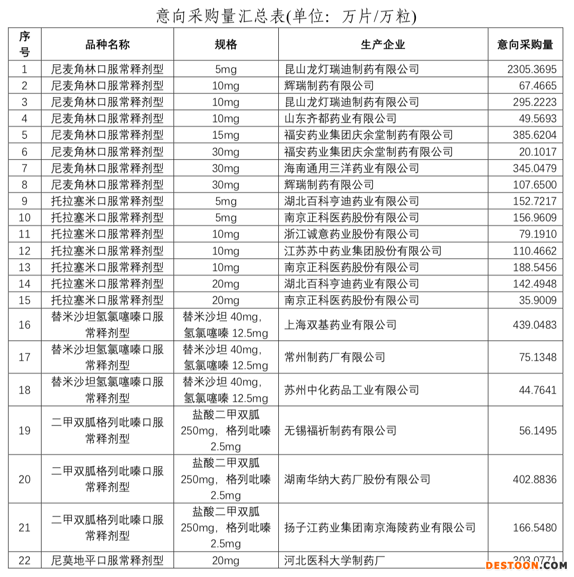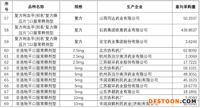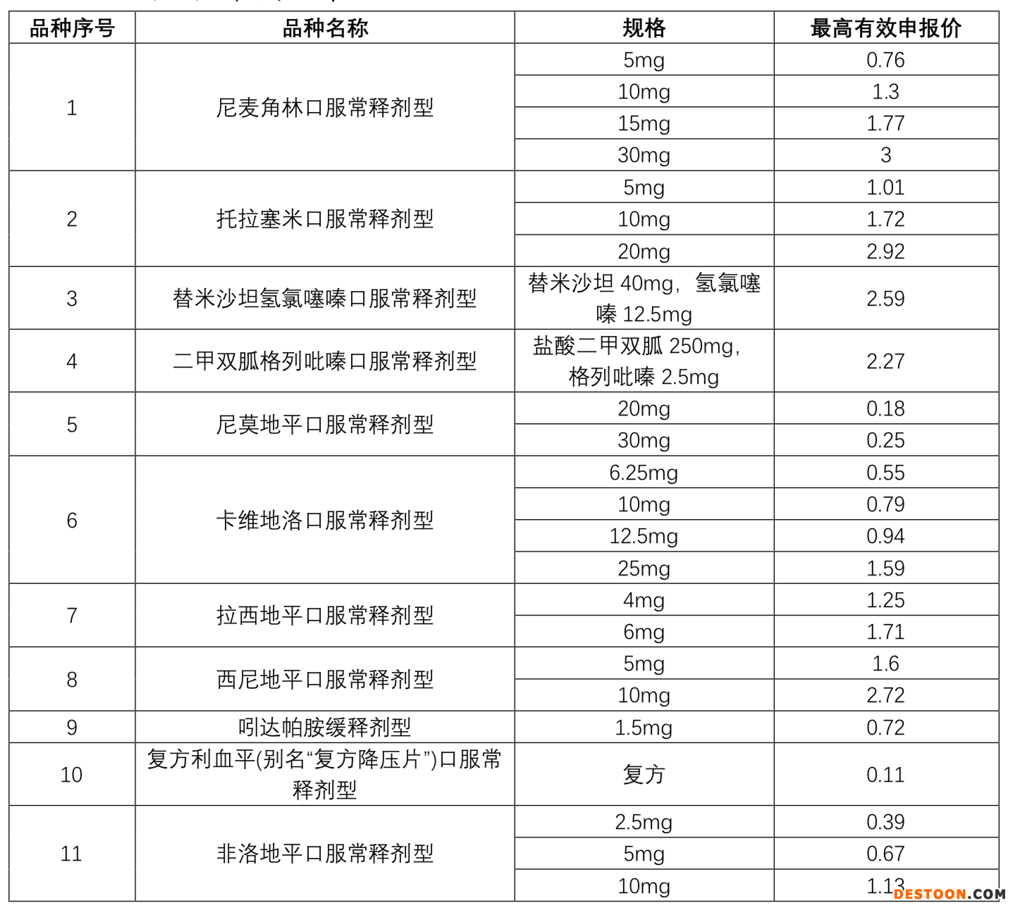 據(jù)了解,共有11個(gè)品種被納入采購(gòu)名單,共24個(gè)品規(guī) ,全部為口服品種;包括尼麥角林口服常釋劑型、托拉塞米口服常釋劑型、替米沙坦氫氯噻嗪口服常釋劑型、二甲雙胍格列吡嗪口服常釋劑型、尼莫地平口服常釋劑型、卡維地洛口服常釋劑型、拉西地平口服常釋劑型、西尼地平口服常釋劑型、吲達(dá)帕胺緩釋劑型、復(fù)方利血平(別名“復(fù)方降壓片”)口服常釋劑型和非洛地平口服常釋劑型。