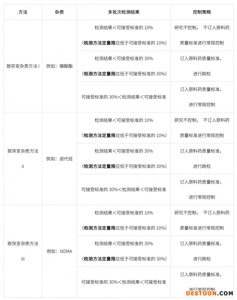 開發(fā)致突變雜質(zhì)相關(guān)方法檢測原料藥中致突變雜質(zhì),雜質(zhì)控制策略如下: