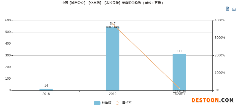公開數(shù)據(jù)顯示,2018 年其全球銷售額為13.5億美元;米內(nèi)網(wǎng)數(shù)據(jù)顯示,2018年5月底,米拉貝隆在中國市場(chǎng)上市當(dāng)年中國公立醫(yī)療機(jī)構(gòu)終端銷售額為14萬元,次年達(dá)到547萬元,同比增長3807.14%。