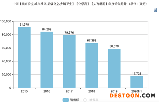 鹽酸頭孢吡肟是一種革蘭陽性和革蘭陰性菌的廣譜殺菌劑,臨床上用于治療成人和2月齡至16歲兒童上述敏感細(xì)菌引起的中至重度感染,也可用于兒童細(xì)菌性腦脊髓膜炎。米內(nèi)網(wǎng)數(shù)據(jù)顯示,該產(chǎn)品在2019年中國公立醫(yī)療機(jī)構(gòu)終端銷售額超過5億元,不過值得注意的是,該藥物的銷售額正在逐年下滑。