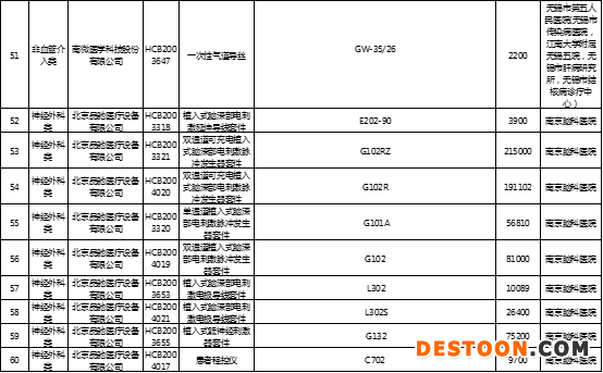從文件中可以看到,此次共計(jì)8大類(lèi)品種,涉及71個(gè)醫(yī)用耗材入圍備案,其中包括微創(chuàng)神通醫(yī)療科技(上海)有限公司的神經(jīng)血管導(dǎo)絲、強(qiáng)生(上海)醫(yī)療器材有限公司的彈簧圈 Codman Microcoil Delivery System、北京品馳醫(yī)療設(shè)備有限公司的植入式骶神經(jīng)刺激器套件等。