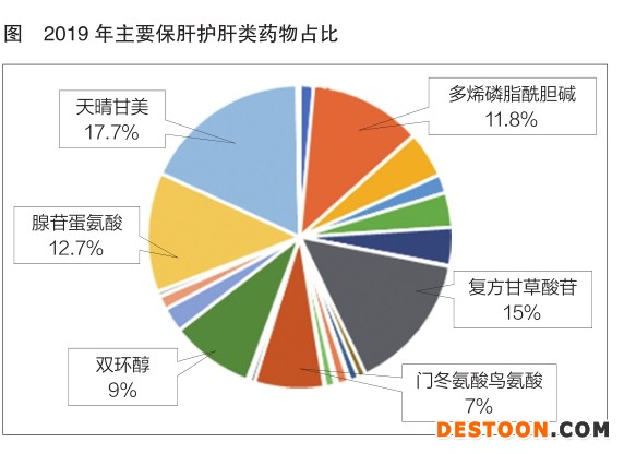 2009~2019年,全國主要樣本醫(yī)院肝保護(hù)類藥品臨床銷售市場占比較大的產(chǎn)品主要有:異甘草酸鎂占比15%,腺苷蛋氨酸占比10.9%,多烯磷脂酰膽堿占比10%,谷胱甘肽占比10%,雙環(huán)醇占比7.5%,門冬氨酸鳥氨酸占比6%。
