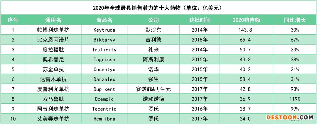 其中,默沙東的帕博利珠單抗、吉利德的比克恩丙諾片、禮來的度拉糖肽、阿斯利康的奧希替尼和諾華的蘇金單抗位居前五名,2020年銷售額同比增長30%、67%、23%、38%和21%。
